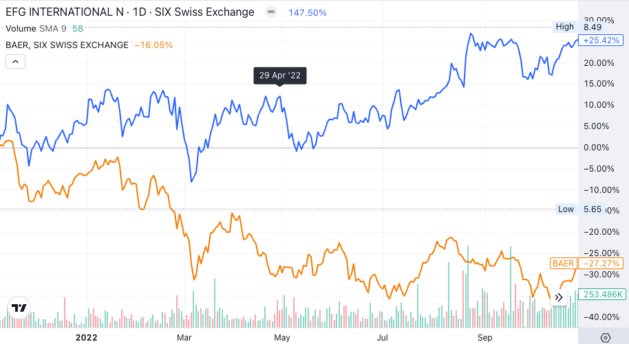 Die EFG-Aktie stieg seither um 25 Prozent, jene der Bär sank um 27 Prozent; in Bolligers noch laufendem 1. Jahr war’s bis jetzt ein Minus um 5 Prozent. EFG? Schossen hoch um 43 Prozent.