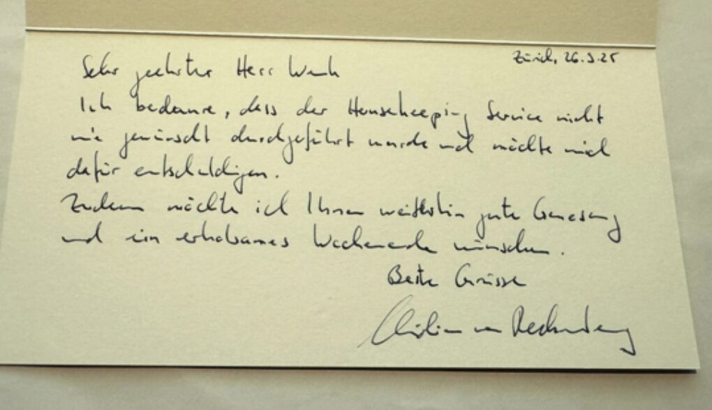Ein Armutszeugnis für das Baur au Lac. Auch das Entschuldigungsschreiben wirkt unbeholfen. Die Bitte um eine etwas frühere Zimmerreinigung ist kein übertriebener Kundenwunsch.