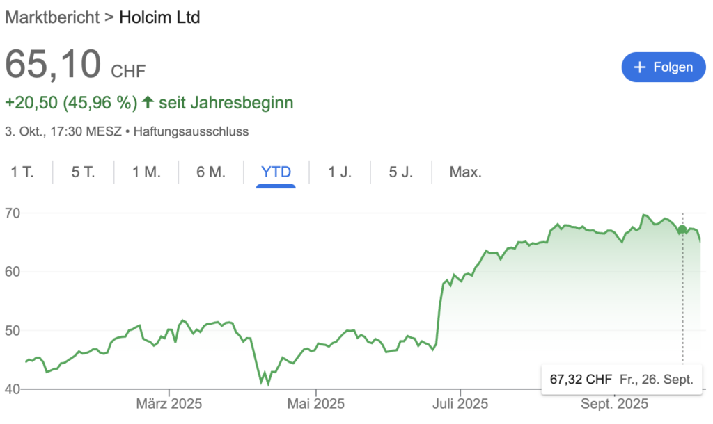 Auch Holcim hat die Zeichen der Zeit erkannt, hoffentlich die KV-Abgänger mittleren Alters ebenso. Bei der Aktie scheint die Luft nach einem tollen Lauf momentan draussen zu sein, Amrize ist bisher eine glatte Enttäuschung.