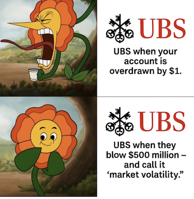 David Skandalenski stolpert schon wieder von einem Desaster ins nächste. Sergio Ermorotti und Colm Kellnix schauen zu und kassieren. Mit solchen Figuren wird UBS schneller zur UBSchrott als ihnen lieb ist.