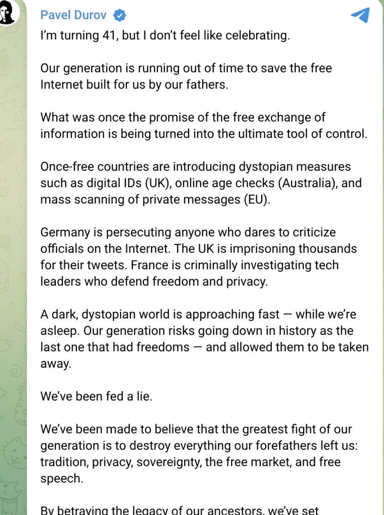 „Eine dunkle, kontrollierte Welt kriecht heran – leise, während wir schlafen“, schreibt Durov. Seine Worte erinnern an Orwell, an eine Zukunft, in der Freiheit nicht plötzlich verloren geht, sondern in Scheiben verschwindet.
