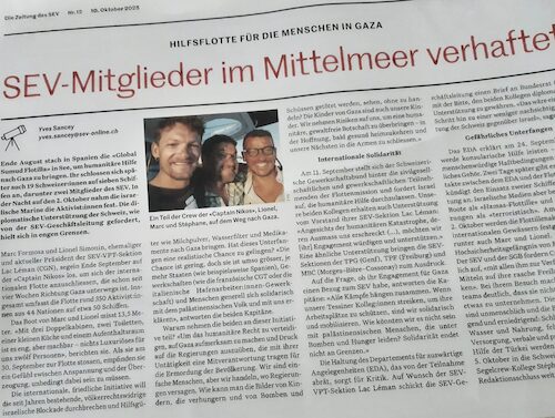 Einen neuen Tiefpunkt liefert die Ausgabe 12 vom 10. Oktober. Mit grossem Stolz wird auf einer halben Seite mit Bild bejubelt, dass sich auf der jämmerlichen Flottille von Greta Thunberg auch zwei Mitglieder des SEV befanden.