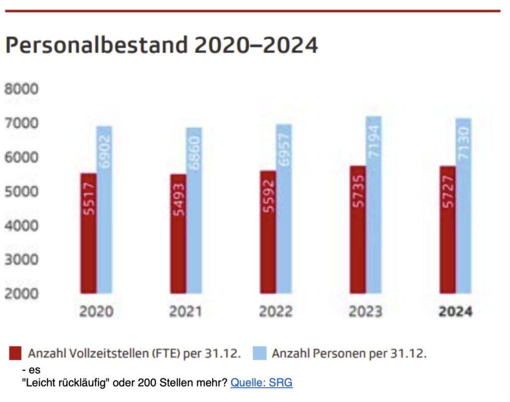 Im Geschäftsbericht ist davon keine Rede. Zwischen 2020 und 2024 sind die Mitarbeiterzahlen gestiegen, wie in keinem anderen Schweizer Medium. Ein Plus von 228 Lohnempfängern.