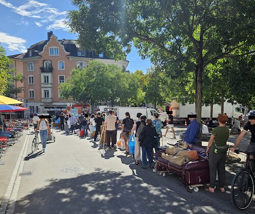 Auf zum temporären Sperrgut-Center auf dem Quartierplatz: Dort stehen sich die Zürcher die Füsse platt, um ihren alten Fernseher und das kaputte Bügelbrett wegzuschmeissen.