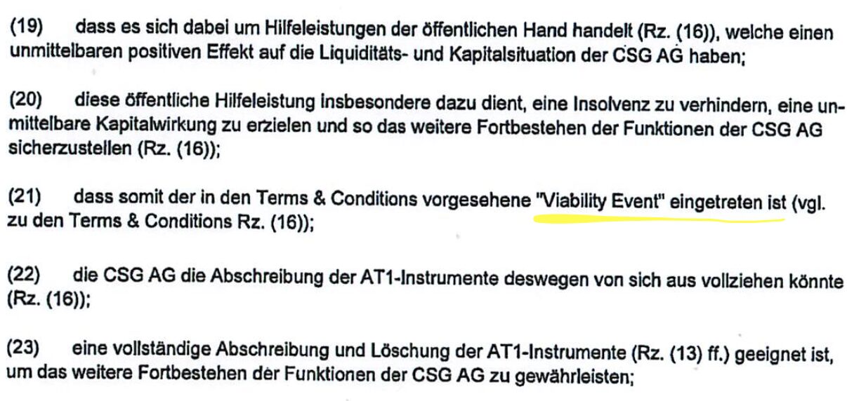Mit anderen Worten. Der Viability Event wäre einfach ein paar Tage/Wochen nach dem Wochendende effektiv durch Marktsituation (CS keine Gelder mehr, Kosten > Einnahmen = Involvenz und EK-Trigger) eingetreten. Die Finma/KKS haben mit Blick auf das System das Recht gesucht/geschaffen, ihn früher auszulösen.