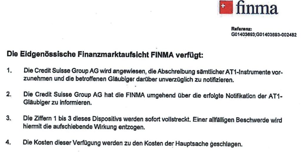 Im konkreten Fall ist juristisch zu prüfen, ob die Voraussetzungen für eine solche Notlage tatsächlich erfüllt waren und ob die FINMA im Rahmen ihrer Kompetenzen handelte – insbesondere angesichts der Tatsache, dass AT1-Inhaber ohne vorgängige Liquidation der Bank und vor den Aktionären vollständig entschädigungslos gestellt wurden. Ob dies mit den geltenden Gesetzen, der Finanzmarktregulierung und verfassungsrechtlichen Grundsätzen vereinbar ist, ist Gegenstand der Überprüfung.
