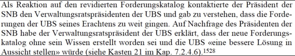 Später meinte dann Kelleher laut PUK-Bericht, er sei über die AT1-Wipeout-Forderung seiner Bank nicht im Bild gewesen. Die UBS würde „eine bessere Lösung in Aussicht stellen“, habe Kelleher gegenüber Thomas Jordan von der SNB ausgeführt.
