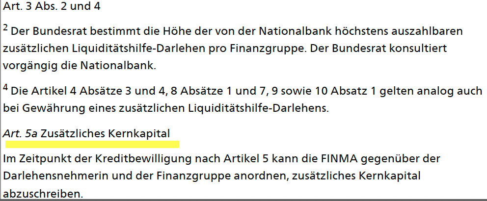 Dieser lautete: „Im Zeitpunkt der Kreditbewilligung nach Artikel 5 kann die FINMA gegenüber der Darlehensnehmerin und der Finanzgruppe anordnen, zusätzliches Kernkapital abzuschreiben.“