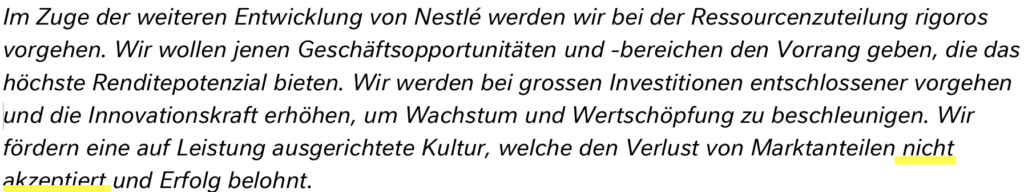 Der Satz ‚Wir fördern eine auf Leistung ausgerichtete Kultur, welche den Verlust von Marktanteilen nicht akzeptiert und Erfolg belohnt.‚ sass!