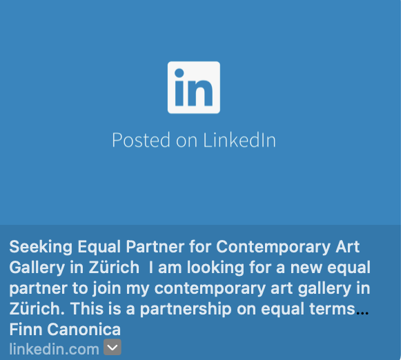 „Ich bin auf der Suche nach einem neuen gleichberechtigten Partner für meine Galerie für zeitgenössische Kunst in Zürich.“