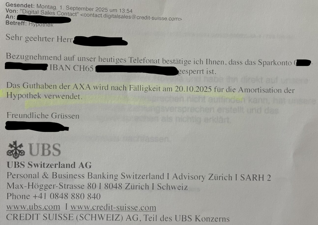 „Das Guthaben der Axa wird nach Fälligkeit am 20.10.2025 für die Amortisation der Hypothek verwendet“, mailte ein UBS-Banker dem Kunden am 1. September.