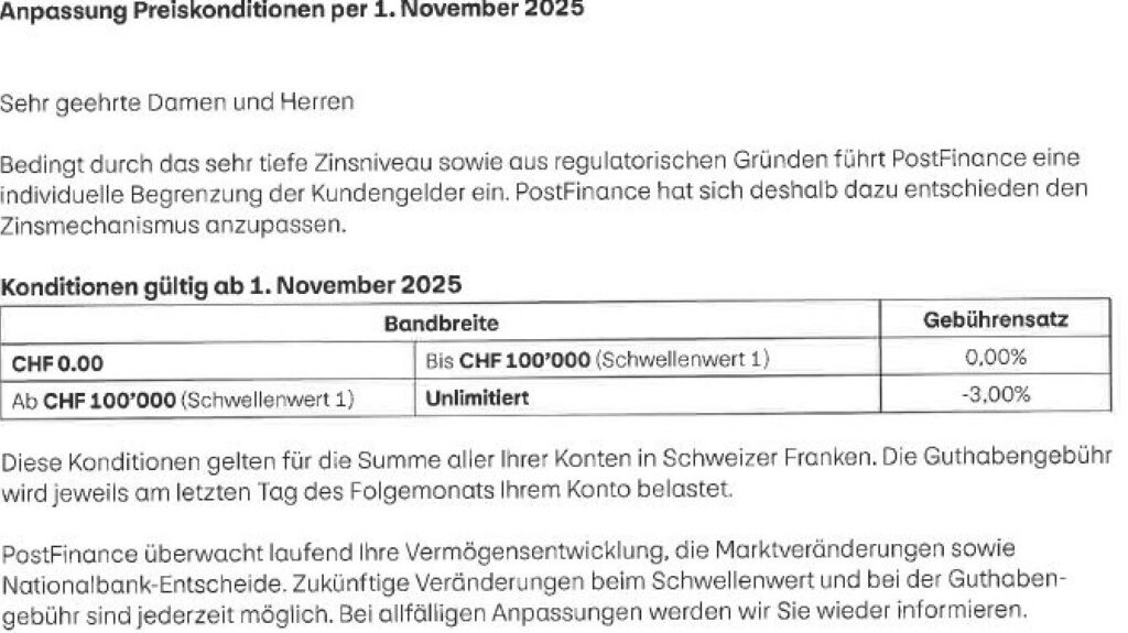 Die Postfinance schockt ihre Kunden. „Anpassung Preiskonditionen per 1. November 2025“ ist ein Schreiben an Betroffene überschrieben.
