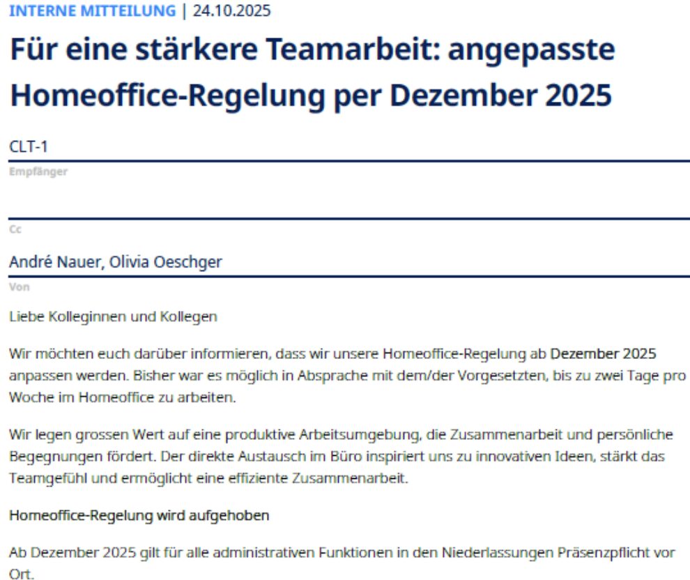 Nun der korrekte Grund, nennt man hier nicht, unsere Teams laufen Sturm, die Löhne und andere Dinge, die nach aussen verkauft werden (jedoch nicht vorhanden sind) sind es nicht. Die kleine Freiheit mit der HO war bei vielen noch ein Grund, dass wir dies über uns ergingen lassen. Jetzt ist jedoch Schluss, diese Herrische verhalten, alle abzustrafen weil die GL versagt, ist schlechtweg nicht mehr zu akzeptieren. Viele werden kündigen, aber dies ist für unseren CEO kein Problem, er findet Mitarbeiter wie Sand an Meer (so kommt es bei uns jedenfalls an) Viel Spass die Kunden wird es freuen
