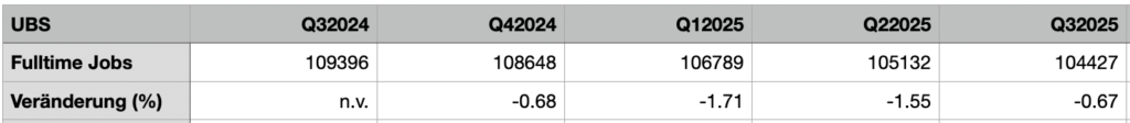 Erneut hat die letzte verbliebene Grossbank des Finanzplatzes massiv Mitarbeiter entlassen, oder diese kündigten von sich aus oder waren alt.