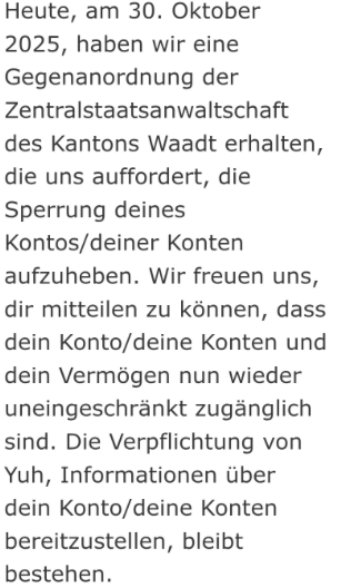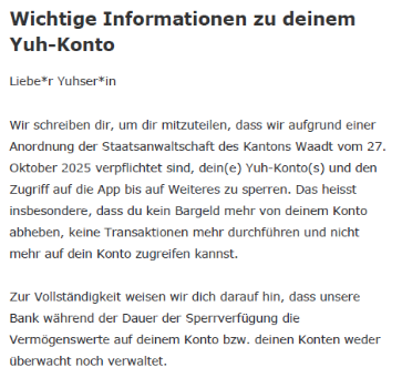 „(A)ufgrund einer Anordnung der Staatsanwaltschaft des Kantons Waadt vom 27. Oktober 2025“ sei man „verpflichtet (..), dein(e) Yuh-Konto(s) und den Zugriff auf die App bis auf Weiteres zu sperren“.