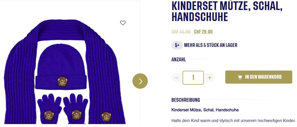 Mütze, Schal und Handschuhe für Kinder landen mitten im Herbst im Ausverkauf. Die Klubgeschichte (in der „Luxus-Edition“) wird 200 Franken günstiger angeboten.