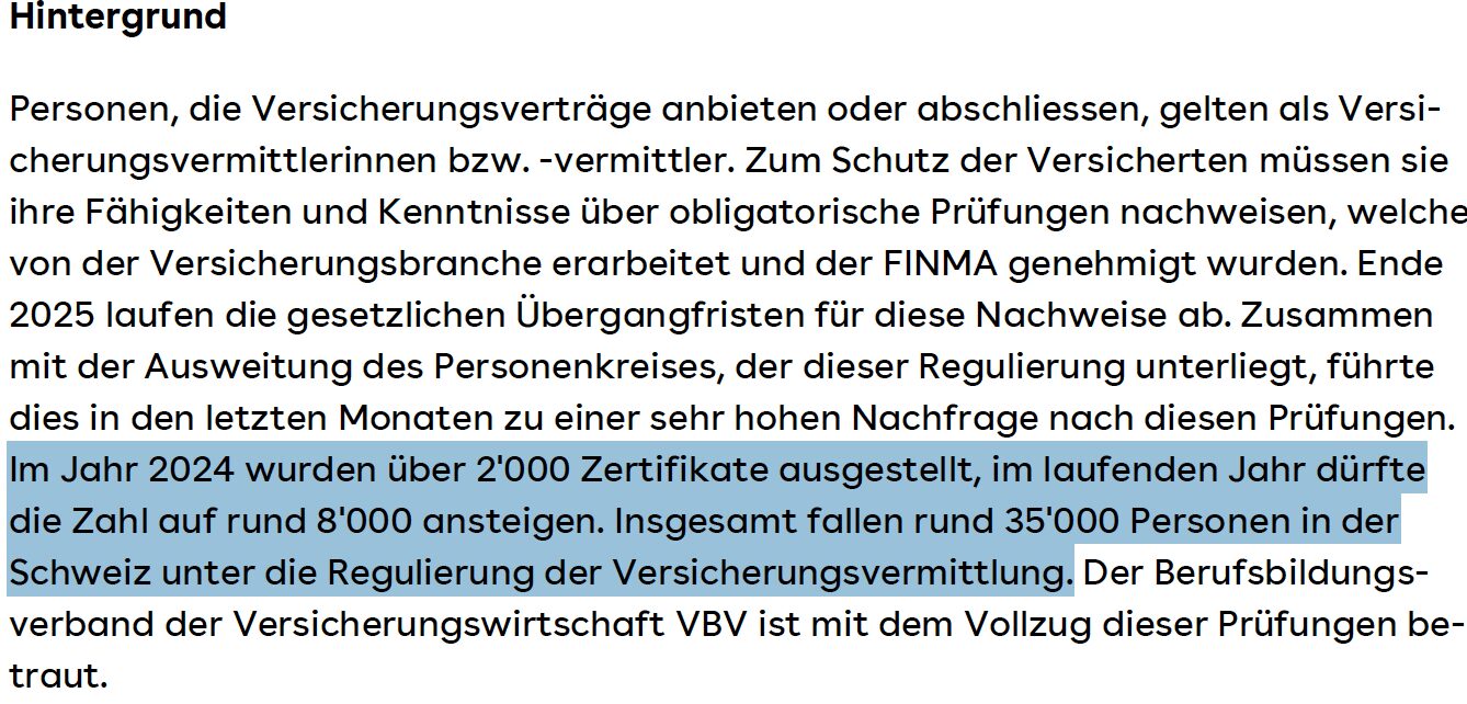 Die Szene ist nicht klein. „Insgesamt fallen rund 35’000 Personen in der Schweiz unter die Regulierung der Versicherungsvermittlung“, so der VBV in seinem gestrigen Communiqué.