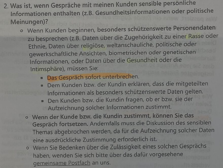 Und: den Kunden fragen, ob er „der Aufzeichnung solcher Informationen zustimmt“. Ist er damit einverstanden, „können Sie das Gespräch fortsetzen“.