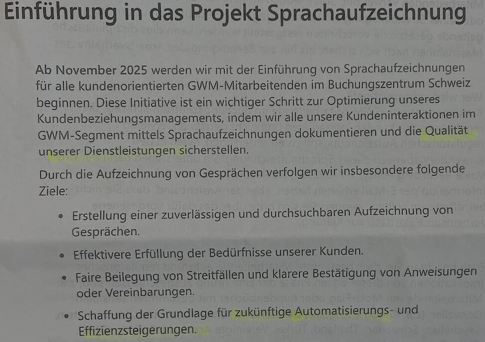 „Ab November 2025 werden wir mit der Einführung von Sprachaufzeichnungen für alle kundenorientierten GWM-Mitarbeitenden im Buchungszentrum Schweiz beginnen“, gehts weiter.