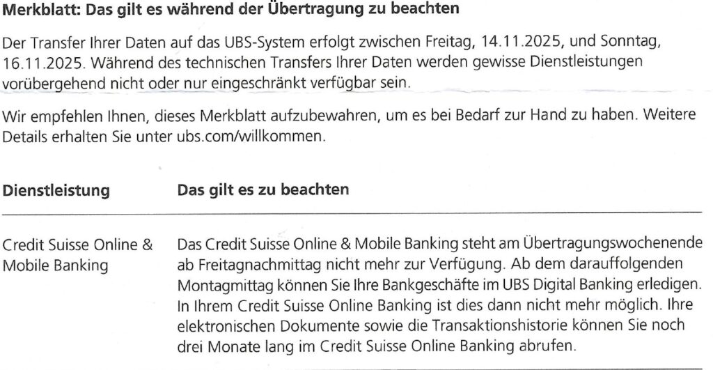 Am Montag, nach dem „Übertragungswochenende“, könne man dann alle „Bankgeschäfte im UBS Online Banking erledigen“.