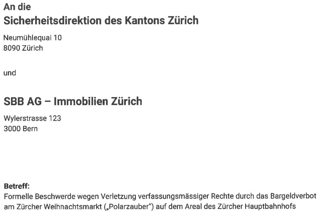 Zudem drohte ein Bürger mit Absender eines Vereins namens „Schweiz-Macher“ mit Klagen. Er hatte Beschwerden beim Kanton Zürich und der SBB eingereicht.