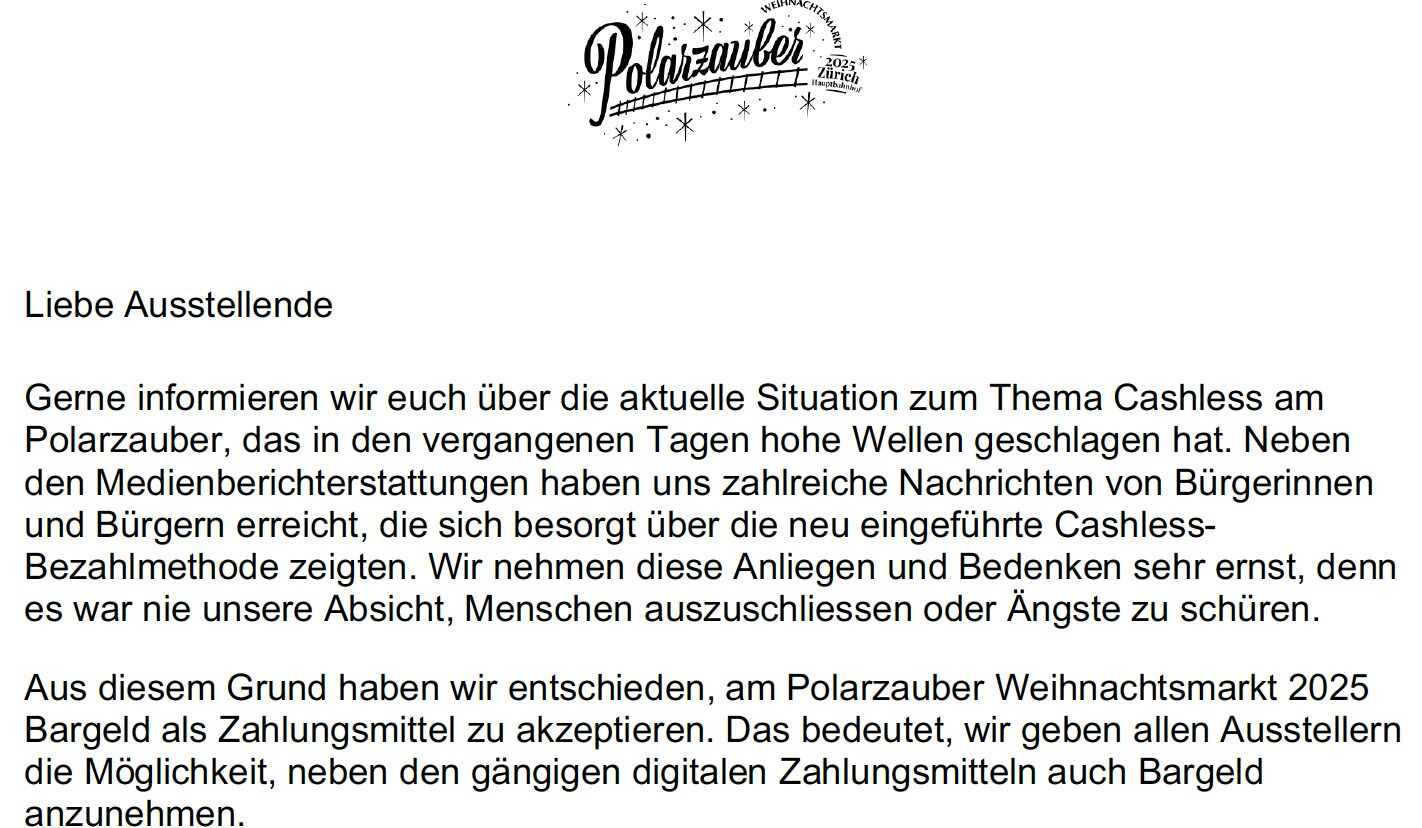 „Neben den Medienberichterstattungen haben uns zahlreiche Nachrichten von Bürgerinnen und Bürgern erreicht, die sich besorgt über die neue eingeführte Cashless-Bezahlmethode zeigten“, schrieb Polarzauber den Ausstellern.