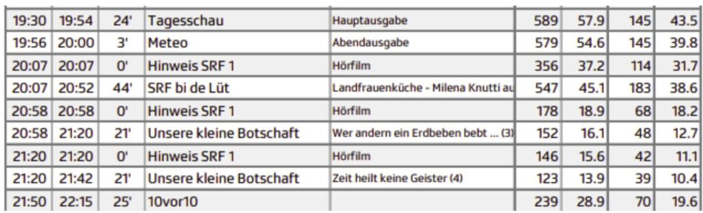 Andererseits zeigt der Quervergleich, wo die Stärken des Senders liegen: in der Information. „10vor10“ und die „Tagesschau“ haben immer noch eindrückliche Beliebtheitswerte.
