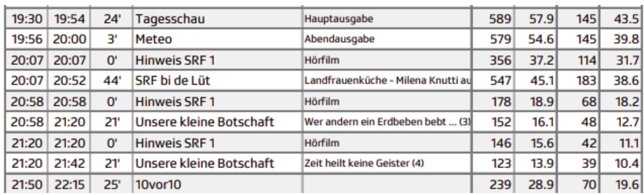 Andererseits zeigt der Quervergleich, wo die Stärken des Senders liegen: in der Information. „10vor10“ und die „Tagesschau“ haben immer noch eindrückliche Beliebtheitswerte.
