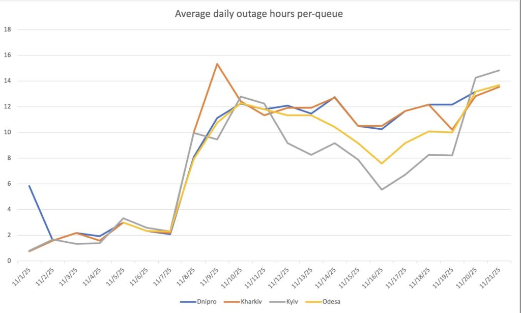 Eine sehr interessante statistische OSINT-Analyse (Open Source Intelligence) von Amerikanets vom 21.November 2025 zeigt, dass zwischen dem 17 und 21. November 2025 in den Grossstädten Kiew, Kharkov, Odessa und Dniepro der Strom zwischen 8 und 15 Stunden am Tag in Form von rollierenden Blackouts ausfiel.