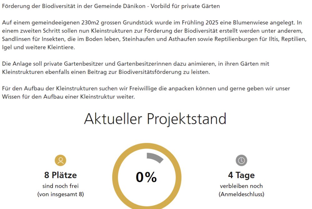 Dafür erhofft sich die Gemeinde Hilfe von den UBS-Bankern. Im Rahmen des Freiwilligen-Netzwerkes Helpetica sollen acht Mitarbeiter kommen, um „Löcher für die Kleinstrukturen“ zu graben.