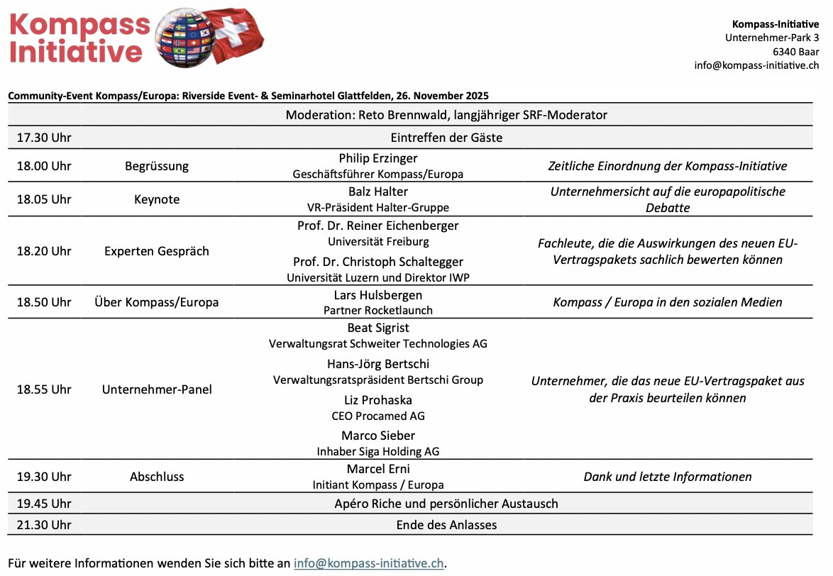 Beim gestrigen Community-Event mit 500 Teilnehmenden im Riverside in Glattfelden, nördlich von Zürich reihten sich die renommierten Professoren Reiner Eichenberger und Christoph Schaltegger sowie zahlreiche Unternehmer in den Chor der Gegner der Bilateralen III ein.