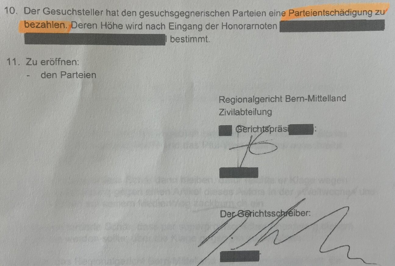Anschliessend liess sich das Berner Gericht fast zwei Monate (!) Zeit, um über diese Superprovisorische zu befinden. Um schliesslich am 25. November zur Einsicht zu gelangen: „Soweit weitergehend wird das Gesuch (von Schär, Red.) vom 29. September abgewiesen.“