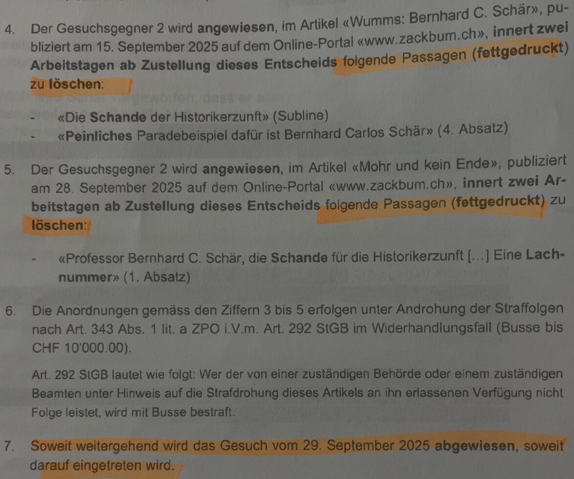 Unter anderem forderte Schär, dass per superprovisorischer Anordnung diesem Autor verboten werden sollte, über die Klage gegen ihn zu berichten.