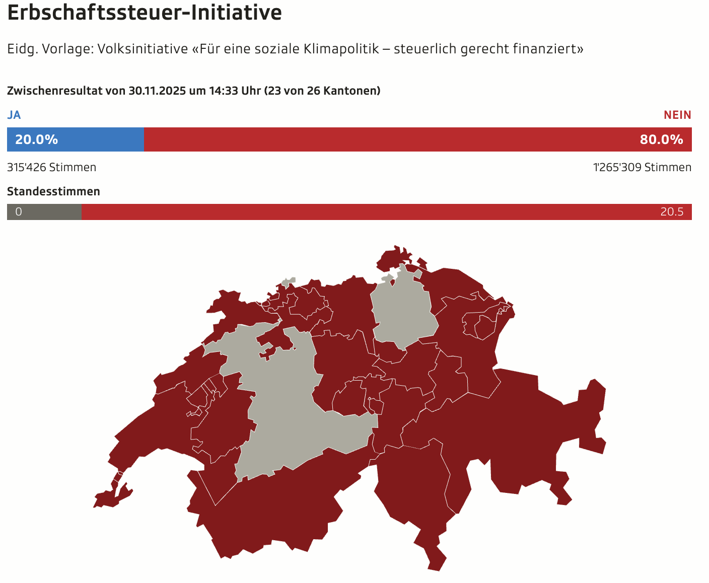 Die Erbschafts-Wucher-Vorlage mit 50 Prozent für Reiche ging sang- und klanglos unter. 20 Prozent, schlechter als die schlimmsten Prognosen für die Jungsozialisten-Initiative.
