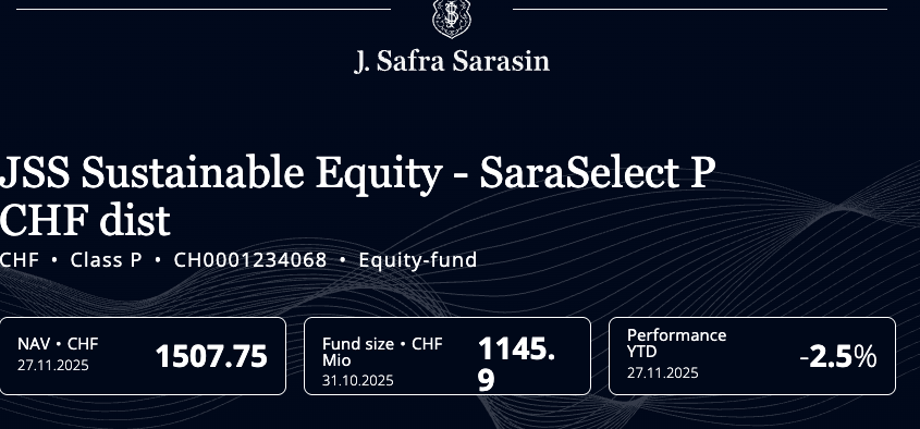 Es handelt sich um den SaraSelect der Safra Sarasin, die zu den wichtigsten Privatbanken des Bankenlandes aufgestiegen ist.