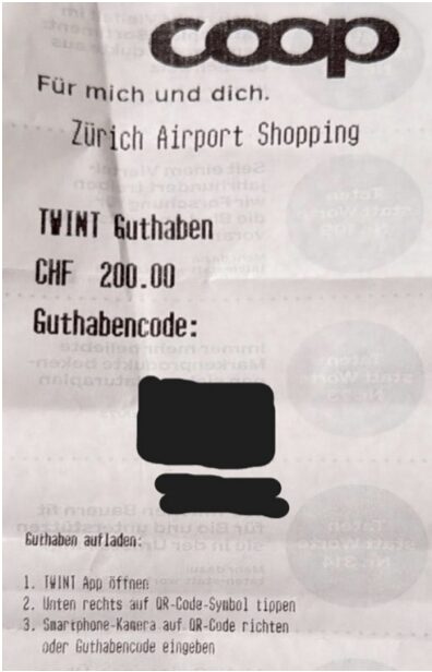 Hier geht es um Twint-Coupons, die man im Coop kauft, um Bargeld aufs eigene Konto zu bringen.