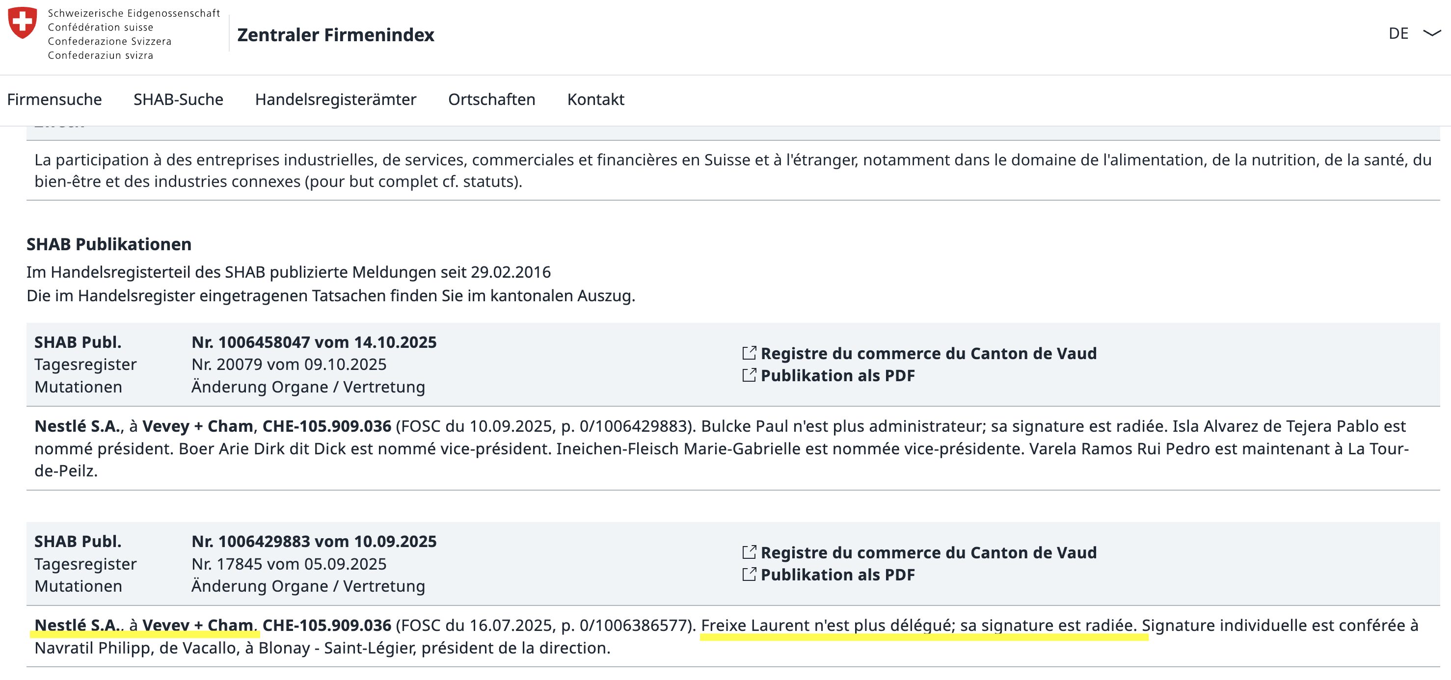 Bei der Nestlé AG in Cham ist Freixe ebenfalls nicht mehr VR-Delegierter; diesen Job erfüllt mit Eintrag vom 5. September der Schweizer Philipp Navratil als neuer CEO der Gruppe.