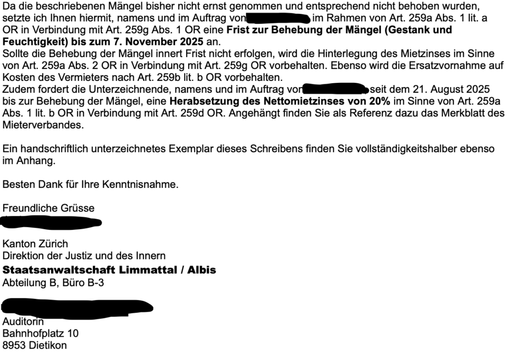 „Da die beschriebenen Mängel bisher nicht ernst genommen und entsprechend nicht behoben wurden, setzte (sic!) ich Ihnen hiermit, namens und im Auftrag von …, im Rahmen von Art. (…) eine Frist zur Behebung der Mängel (Gestank und Feuchtigkeit) bis zum 7. November 2025 an.“