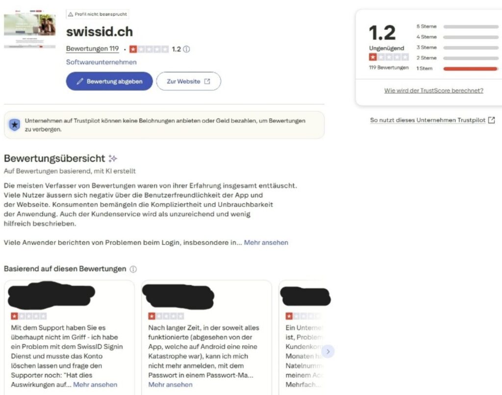 In den Trustpilot-Bewertungen zeichnet sich ein klares Bild: Die SwissID kassiert breite technische Kritik – von „mangelhaft“ bis „unerklärlich kompliziert.