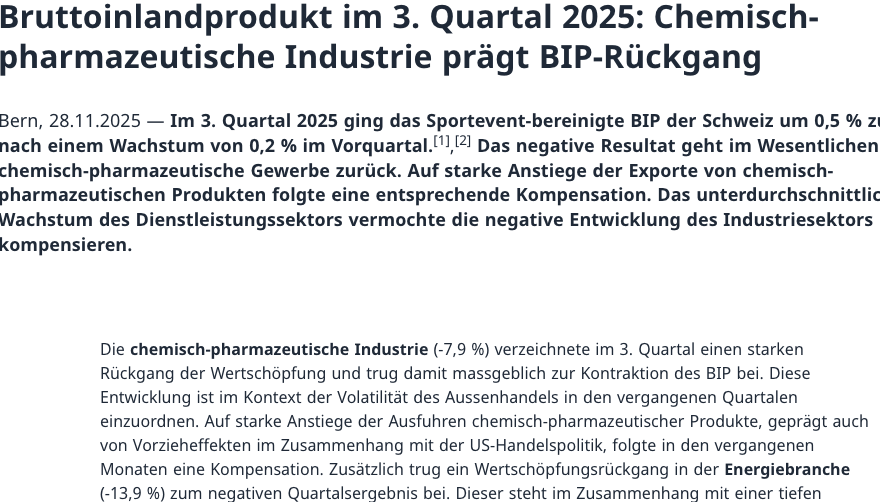 Nach Trumps Zollhammer von August gings rapide bergab. Die Schweizer Wirtschaft schrumpfte im 3. Quartal um 0,5 Prozent. Schuld war die Pharma mit einem Crash um 8 Prozent.
