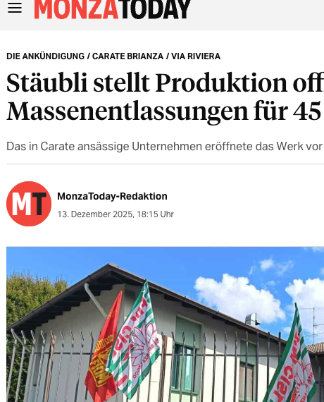 „Es handelt sich um eine Verlagerung der Produktion in existierende Standorte in Frankreich, welche einen Abbau von 45 Stellen am Standort Carate Brianza zur Folge hat“, bestätigt eine Firmen-Sprecherin eine Story in „Monza Today“.