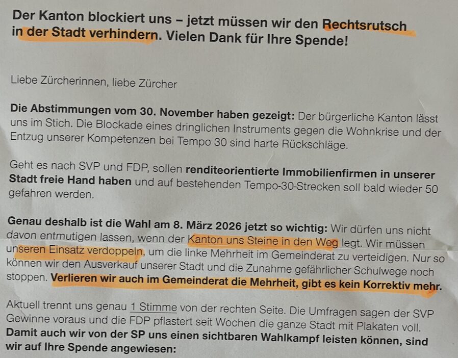 Man müsse den „Einsatz verdoppeln“, forderte kürzlich die SP-Rennleitung Zürichs Bürger mittels Flyer in die Haushalte auf. „Nur so können wir den Ausverkauf unserer Stadt und die Zunahme gefährlicher Schulwege noch stoppen.“
