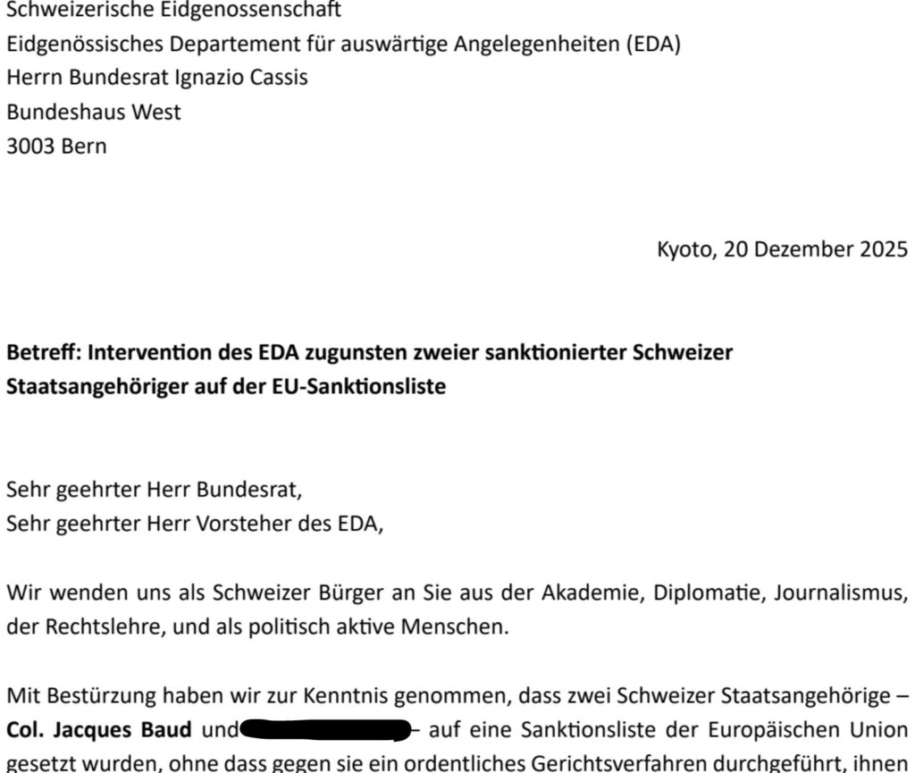 „Mit Bestürzung haben wir zur Kenntnis genommen, dass zwei Schweizer Staatsangehörige – Col. Jacques Baud und N. – auf eine Sanktionsliste der Europäischen Union gesetzt wurden, ohne dass gegen sie ein ordentliches Gerichtsverfahren durchgeführt, ihnen rechtliches Gehör gewährt oder ihnen konkrete strafrechtlich relevante Handlungen nachgewiesen worden wären.“
