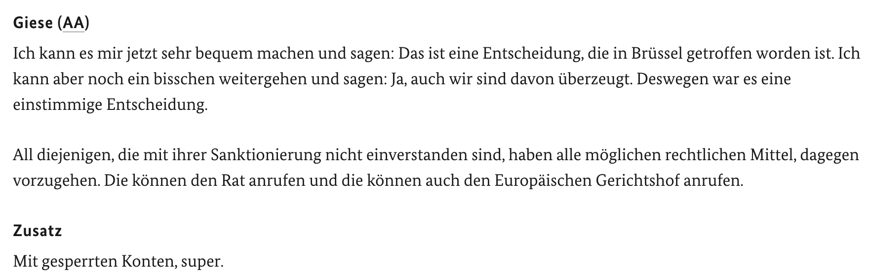 Wenn nicht genehme Meinungen für die EU bereits Grund dafür sind eine unbescholtene Personen zu sanktionieren und das notabene auch noch einstimmig beschlossen wird, dann kann man auch hier wieder von Gesinnungsjustiz reden. So wie wir es auch im eigenen Land durch rot-grüne Richter erleben und es in Deutschland und der Rest-EU schon lange gang und gäbe ist.