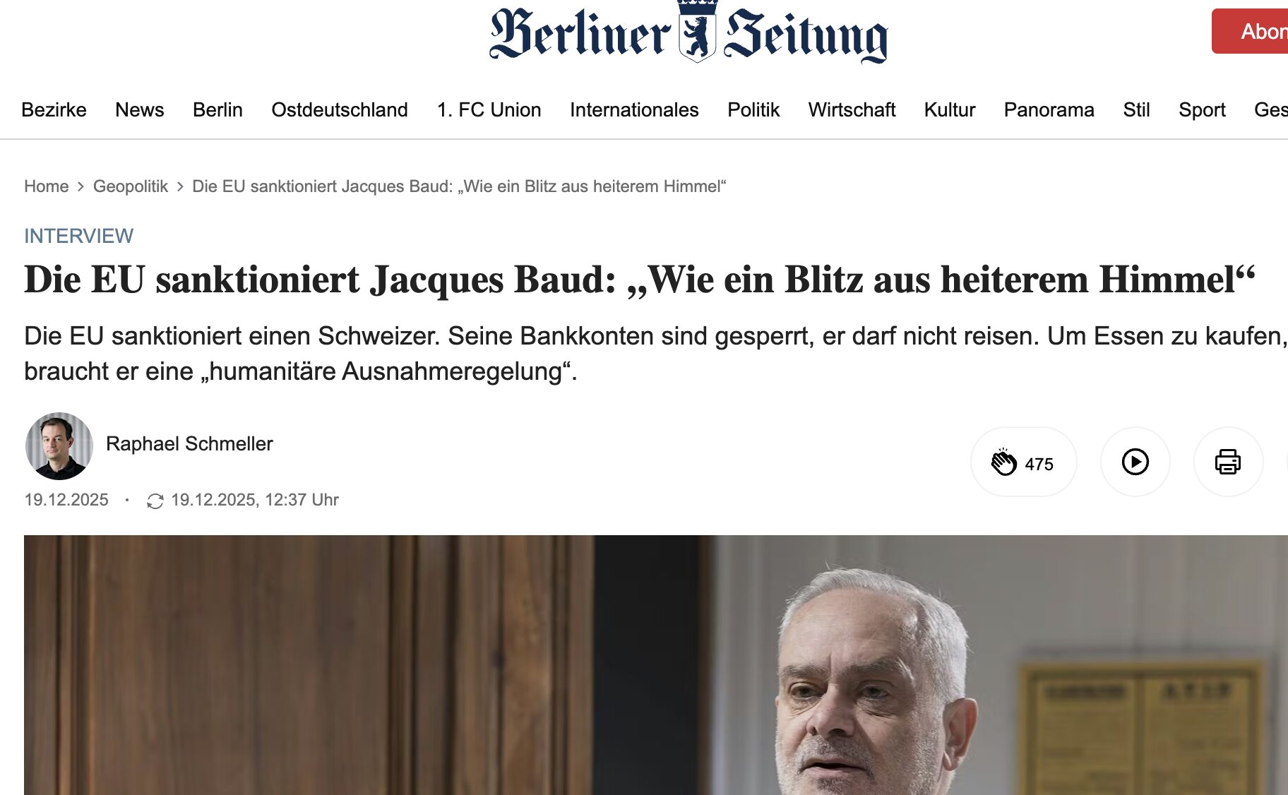 Die Sanktionen durch die EU sind durch Nichts zu begründen und rechtlich unhaltbar. Die Haltung von Cassis und dem EDA und das Wegducken und Schweigen sind genau so schlimm, wenn nicht noch schlimmer. Was haben wir nur für eine katastrophale, EU-hörige Regierung. Das hat Herr Baud und die Schweiz nicht verdient.