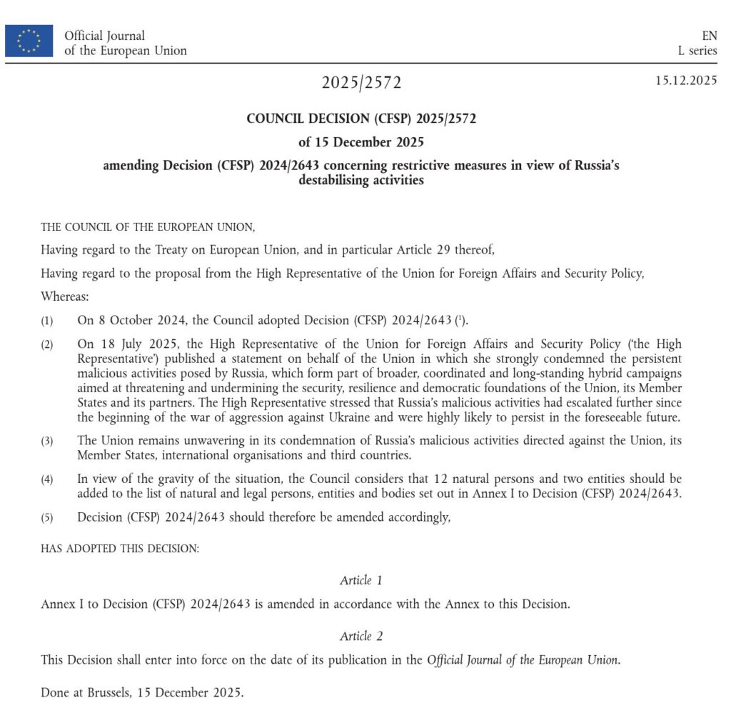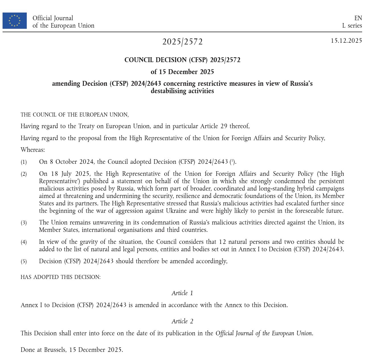 Darauf wiederum fusst der Beschluss (GASP) 2024/2643 des Rates samt begleitende Durchführungsverordnung nach Art. 215 AEUV.