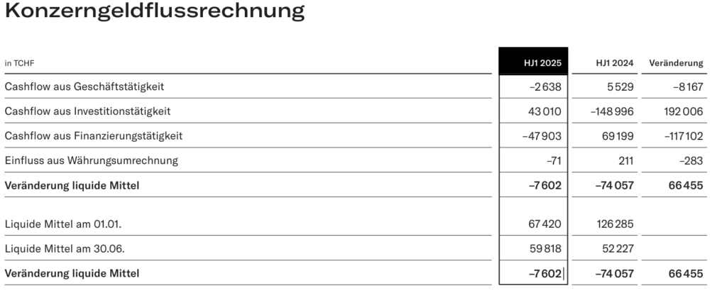 Der Cashflow aus dem Tagesgeschäft ist zum Erliegen zu kommen. Von plus 5,5 Millionen im ersten Halbjahr 2024 zu minus 2,6 Millionen im Vergleichsquartal 2025.