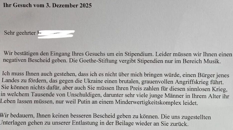 „Die Goethe-Stiftung vergibt Stipendien nur im Bereich Musik“, so Bührles Begründung in seinem Antwortschreiben auf das Gesuch des Manns vom 3. Dezember.