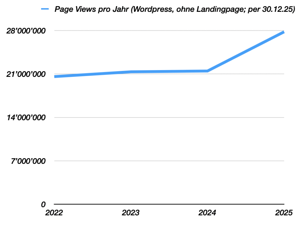Insgesamt legte IP 2025 zu. Die Seitenaufrufe stiegen um rund 29 Prozent. Die Zahlen beruhen auf der Auswertung des eigenen Systems (WordPress). Bei Google Analytics (inkl. Landingpage) waren es 50 Millionen Views, dort beträgt das Plus 13 Prozent.