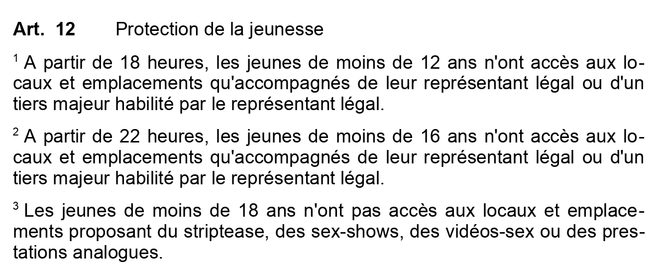 „A partir de 22 heures, les jeunes de moins de 16 ans n’ont accès aux locaux et emplacements qu’accompagnés de leur représentant légal ou d’un tiers majeur habilité par le représentant légal.“